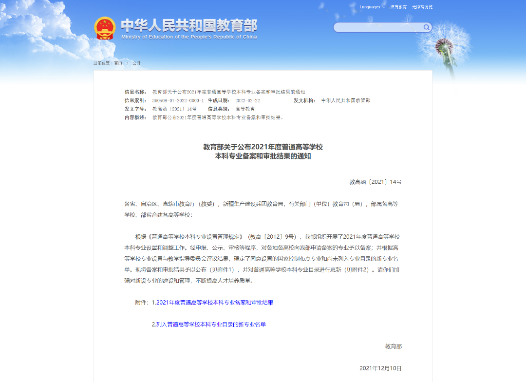 近日,教育部发布了《教育部关于公布2021年度普通高等学校本科专业备案和审批结果的通知》(教高函〔2021〕14号),我校新增汉语言文学、金融科技、机械电子工程、建筑学、人工智能、数据科学与大数据技术等6个专业。新增专业聚焦服务国家战略和民生急需,未来发展潜力巨大。我校此次新增获批的6个专业,聚焦国家战略、区域经济社会发展和民生急需,依托学校办学优势和特色,用好学科交叉融合的“催化剂”,积极布局新文科、新工科急需专业,促进我校多学科协同发展,丰富专业办学内涵,更好地服务行业和经济社会发展。