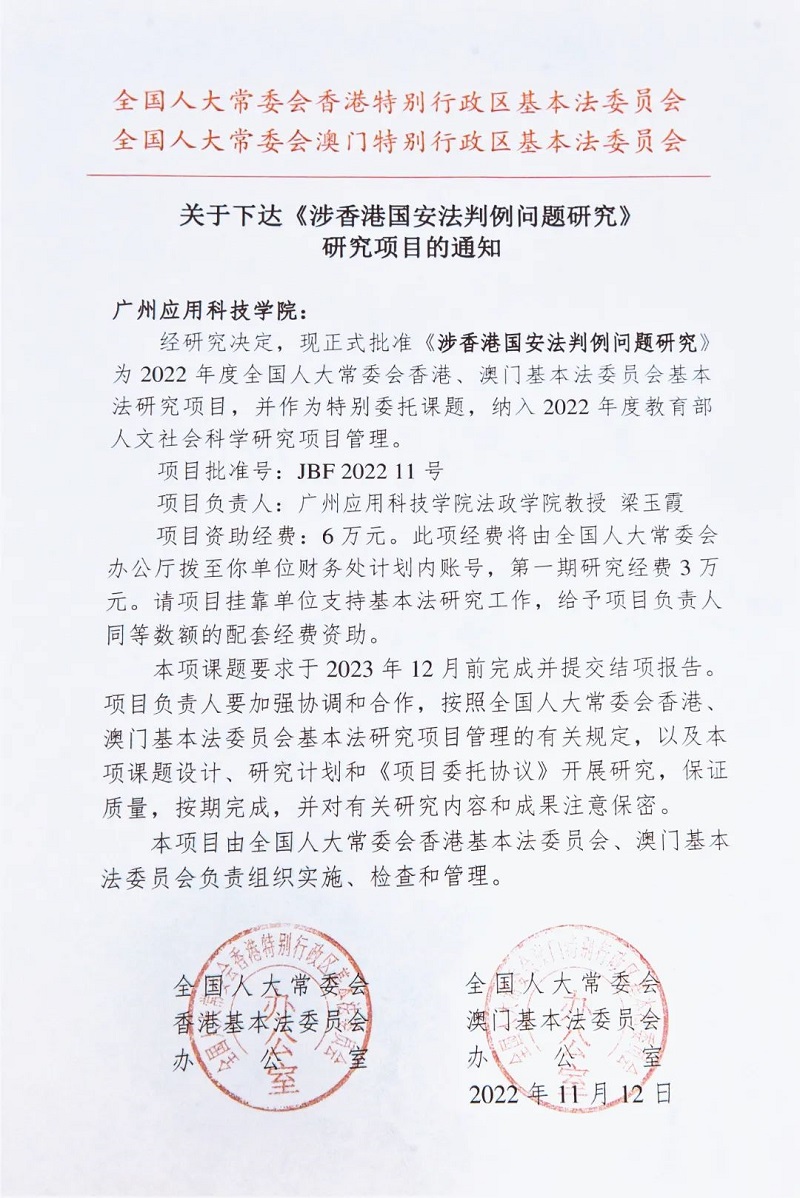 近日,全国人大常委会基本法委员会办公室发文,正式批准我校法政学院院长梁玉霞教授申报的《涉香港国安法判例问题研究》,为2022年度全国人大常委会香港、澳门基本法委员会基本法研究项目,并作为特别委托课题,纳入2022年度教育部人文社会科学研究项目管理。