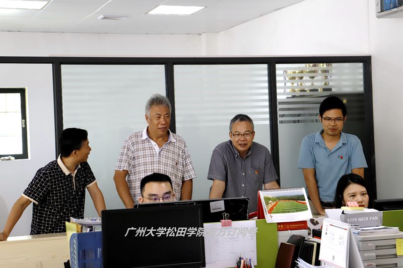 ▲7月27日,广州大学松田学院校长庞永师(后排左二)、党委书记王永云(后排右二),在招生办公室主任欧仕身(左一)、党办主任陈贤明(右一)等的陪同下,到我校招生录取现场看望慰问工作人员,指导录取阅档工作。